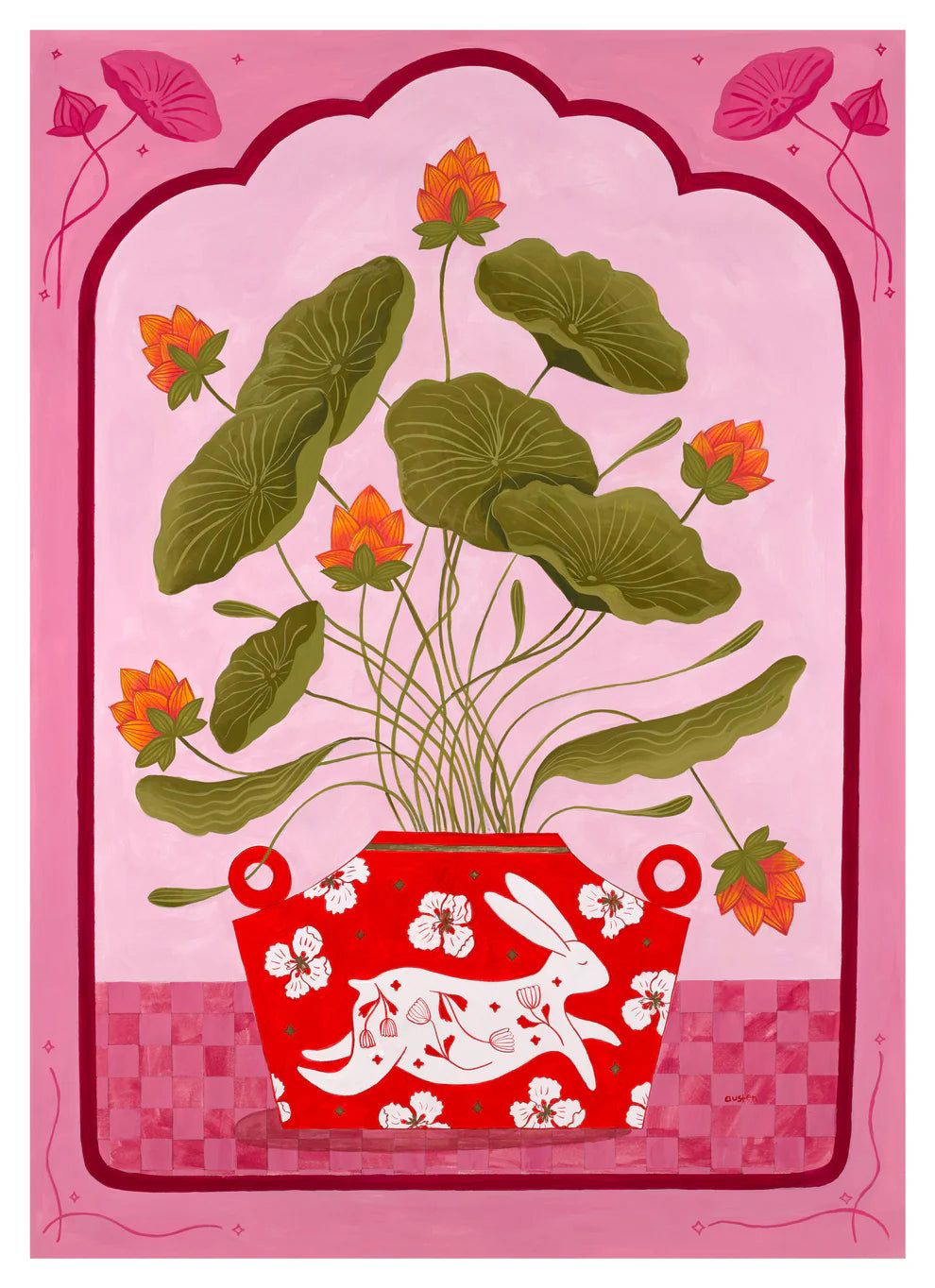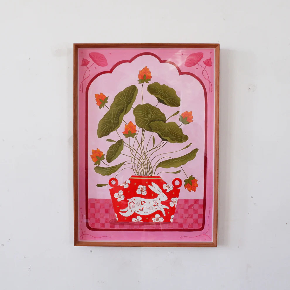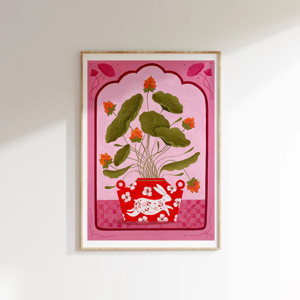 This fine art print features a lush botanical arrangement set in a richly patterned red vessel, adorned with floral details and a playful hare motif. Soft green foliage and warm orange blooms stand out against a pink-toned background, creating a joyful, decorative composition with a contemporary folk-art feel.